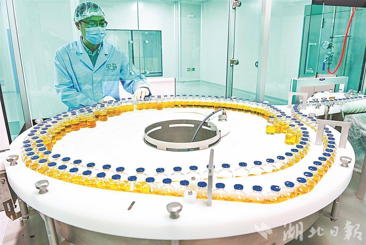1月9日,在武汉光谷禾元生物植物源重组人血清白蛋白智能化工厂里,植物源重组人血清白蛋白正在下线。(湖北日报全媒记者 朱熙勇 摄)